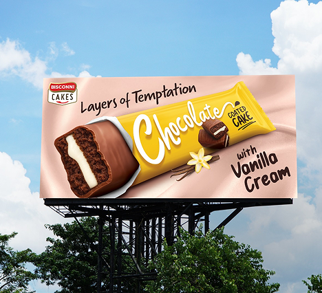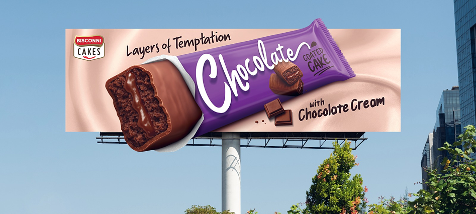 The bold purple & yellow packaging of Bisconni Cakes instantly signals rich chocolate indulgence, standing out on shelf and on street.